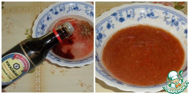 Добавляем растительное масло, сахар, смесь перцев и соевый соус ТМ "Kikkoman".
