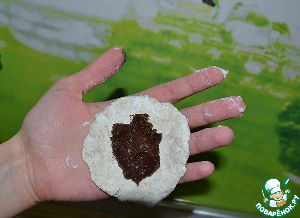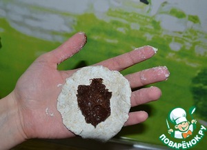 Разделить тесто на 6 частей и из каждой сделать лепешку. Внутрь кладем чайную ложку начинки.