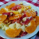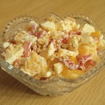 • Яблоки очистить, нарезать кубиками, дольки апельсина разрезать пополам, удалить семечки, добавить орехи (крупные измельчить), всё смешать, заправить майонезом (йогуртом).
