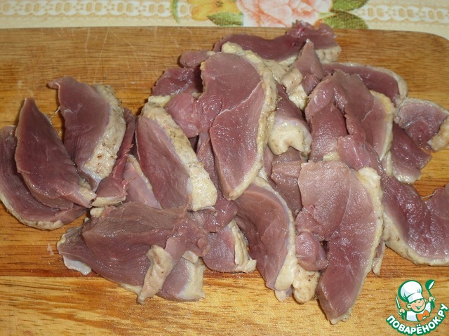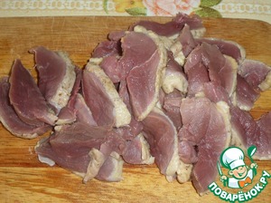 Утиное филе нарезаем ломтиками толщиной 0,5 - 1 см.