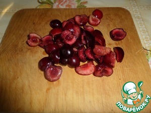Черешню промываем водой, очищаем от косточек и разрезаем каждую ягоду на 2 части.