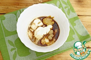 Готовим маринад. В сметану добавляем горчицу, соевый соус и имбирь, перемешиваем.