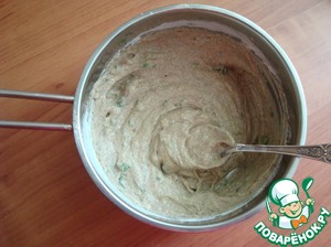 Налила в посуду кефир, погасила в нём соду, добавила сахар, соль, яйцо. Всё перемешала. По ложке вмешала ржаную муку и положила мелко порезанный зелёный лук.