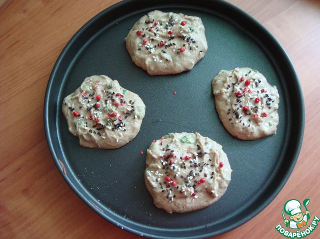 Выложила 4 шт лепёшки, можно одну большую. Присыпала чёрным и белым кунжутом и розовым перцем горошком и поставила в эл. духовку разогретую при т-180 С на 15 минут.