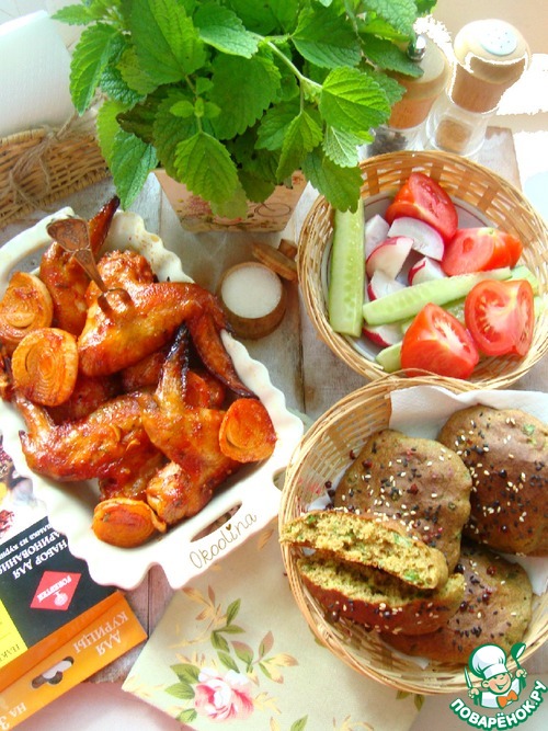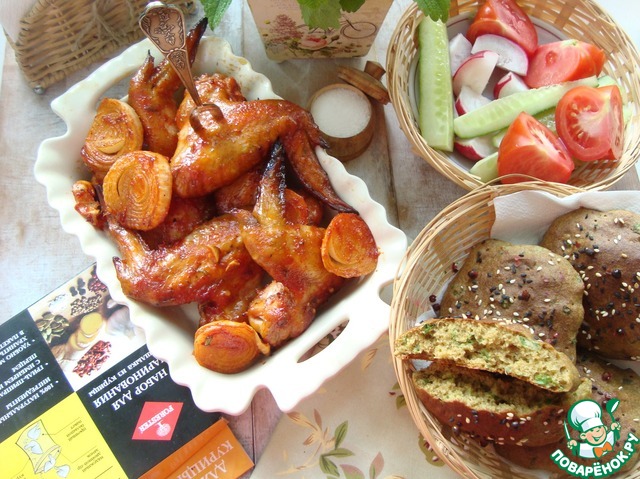 Крылышки, замаринованные с приправой для курицы от FORESTER, с луком, чесноком, мёдом, томатной пастой, майонезом и острым сливовым рассолом из-под маринованной жёлтой сливы. К крылышкам сделала ржаные луковые лепёшки с кунжутом и розовым перцем.