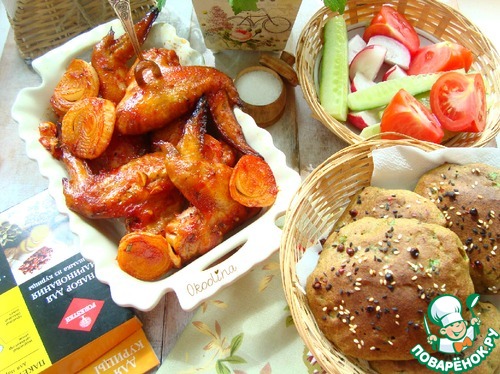 К крылышкам за 15 минут сделала ржаную, луковую лепёшку. Вернее, хотела сделать одну, а выложила 4 шт небольших. На вкус это не повлияло.