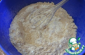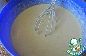 Взбить слегка яйца. Смешать кефир и 350 мл. молока, яйца и вылить в сухую массу. Тщательно размешать венчиком. Масло сливочное растопить, остудить, влить в тесто. Тесто как густая сметана.