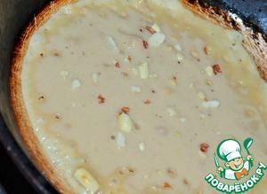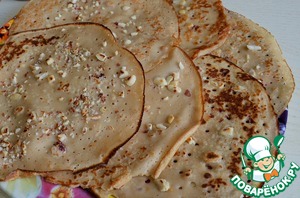 На раскаленной сковороде отпекать блинчики, посыпая по 1/2 ч. л. орехов. Печь до легкого румянца с обеих сторон.