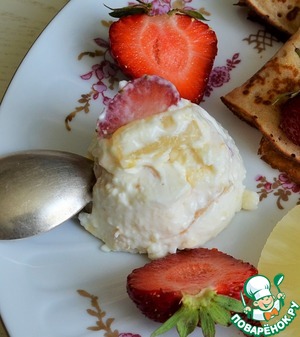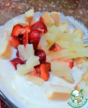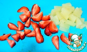 Клубнику вымыть, обсушить. Нарезать на дольки клубнику и консервированные ананасы.
