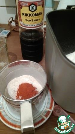 Загружаем в ведро ХП все ингредиенты согласно инструкции. Муку, кориандр, паприку и жгучий перчик я просеиваю вместе, чтобы они хорошо распределились.