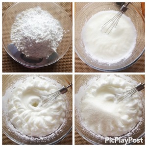 Смешиваем сахарную пудру вместе с мукой. Белки взбиваем в крепкую пену.