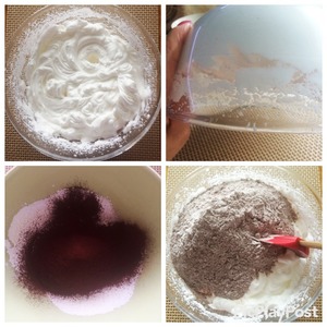 Просеиваем муку, сахарную пудру и какао и добавляем к белкам. Аккуратно перемешиваем лопаткой, получится густое тесто. -