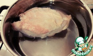 Грудку достаем остывать, а бульон я ставлю в ванну с холодной водой. -