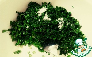 Зеленый лук и зелень нарезать первыми и немного присолить, перемешать. Так зелень становится более ароматной.