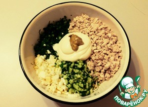 Режем кубиком огурцы, яйца, остывшую грудку.