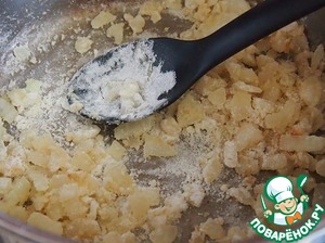 Лук порезать, поджарить в кастрюле на сливочном масле, лук не должен потемнеть, а только стать мягким. Насыпать две ложки муки, размешать.