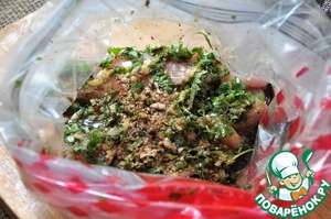 Открываем мешок из набора. Укладываем в него филе, кинзу, чеснок, специи, соевый соус и растительное масло. Герметично закрываем, встряхиваем и отправляем в холодильник минимум на часок.