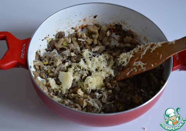 Обжарить сначала грибы, затем добавить лук, чеснок, посолить, поперчить, добавить натерый на терке сыр.
