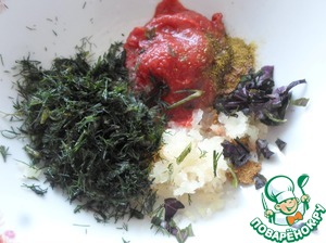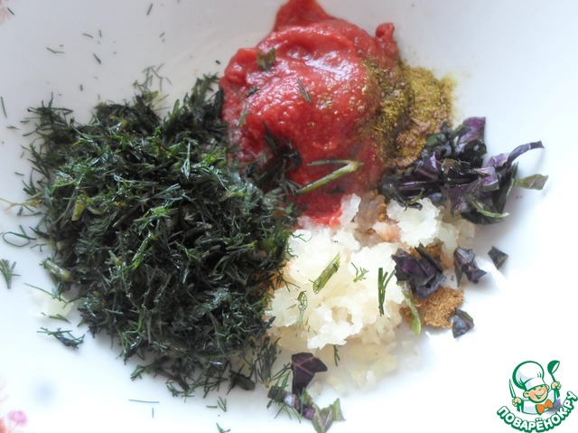 Для маринада смешиваем томат, укроп, базилик, хмели-сунели, соль, орех мускатный, чеснок пропущенный через чеснокодавку.