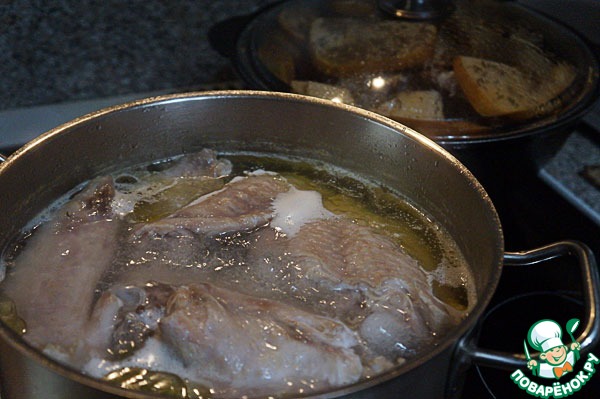 Для этого супа я взял пеструю фасоль. А бульон использовал тот, в котором предварительно отваривал крылышки той же индейки совсем для другого блюда. «Крылышки» - это же ласково: у индейки-то какие крылышки?! Дельтаплан! Поэтому бульон получился и наваристый, и достаточно жирный. И еще необычное: картошки в этом супе нет, зато есть сельдерей и репа.