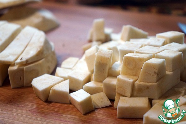 Сельдерей и репу очистить, порезать некрупным кубиком, со стороной сантиметра полтора-два. -