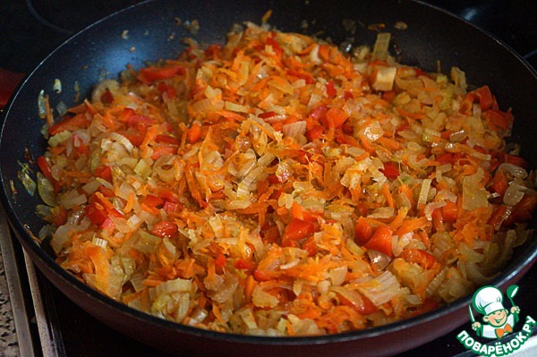 Пока варится фасоль, сделать зажарку. Разогреть в сковороде оливковое масло, отправить в него по очереди лук, морковь и сладкий перец. Обязательно немного посолить, можно и поперчить. Как только овощи обжарились, убавить огонь, накрыть крышкой и тушить до полной мягкости.