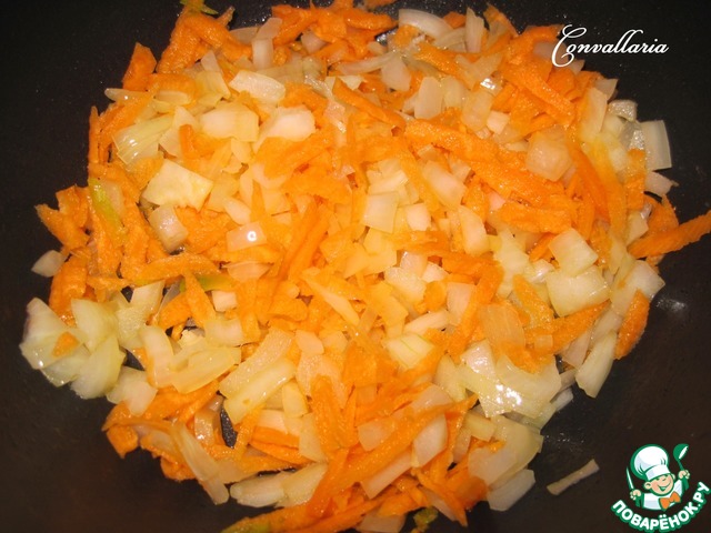 • Лук мелко нарезать, морковь натереть на крупной терке.