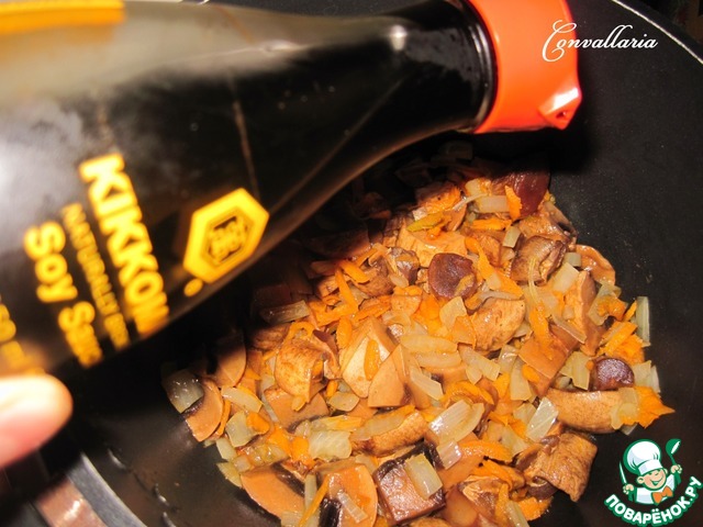 • Добавить нарезанные шампиньоны и соевый соус, готовить еще 5 минут.
