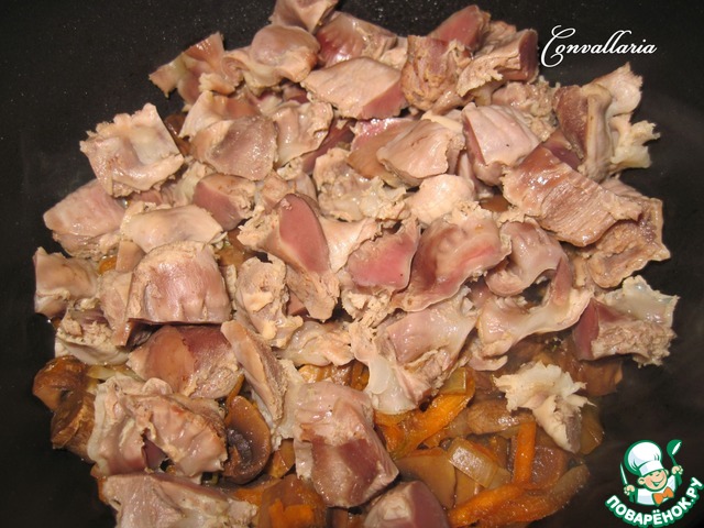 • Куриные желудки нарезать на кусочки, переложить в сотейник.