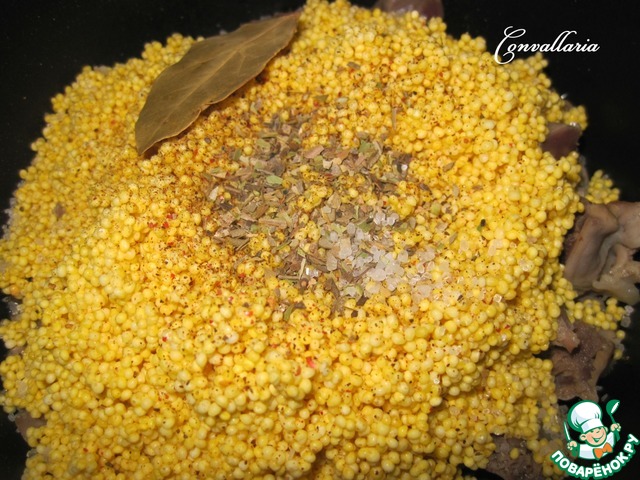 • Пшено промыть под проточной водой, всыпать в сотейник, добавить травы, смесь перцев, лавровый лист, соль.
