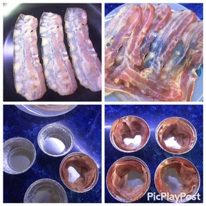 В формочки для бриошей/маффинов укладываем бумажные формочки для маффинов/панкейков/к ексиков (в моем случае одноразовые формочки, поэтому мне не понадобились бумажные, также можно в силиконовые формочки). Затем раскладываем поджаренный бекон по две полоски в каждую формочку.