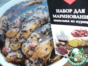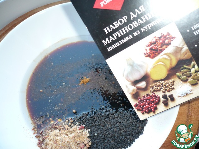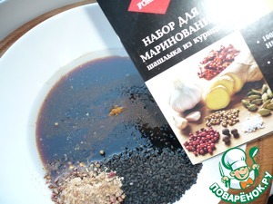 Приготовим маринад: из растительного масла, соевого соуса, кориандра, красного жгучего перца, черного кунжута и приправы для курицы "Forester".
