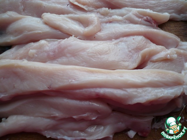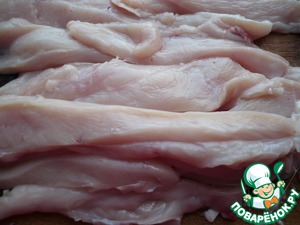 В приготовленный маринад положить нарезанные полоски куриного филе и поставить мариноваться на 30 минут.