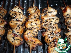 Разложить шпажки на противень-гриль "Forester". Разводим мангал, даём углям прогореть. Жарить куриные шашлычки на среднем огне до готовности, периодически переворачивая.