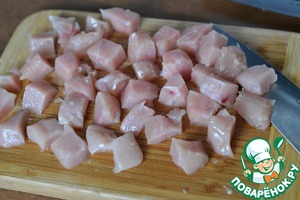 На сковороде, на подсолнечном масле обжарить филе курицы до готовности.