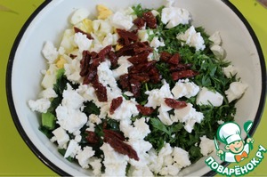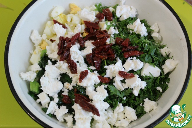 Капусту хорошенько отжать и положить в чашу, добавить зеленый лук, порезанную петрушку, вяленые помидоры (мелко порезать), раскрошить брынзу, добавить порезанные кубиком яйца, перец и соль - с солью аккуратно, если используете брынзу.