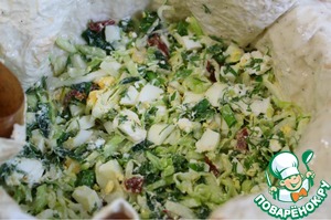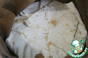 Выкладываем в форму лист лаваша, смазанной стороной наверх.