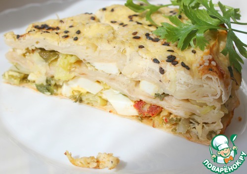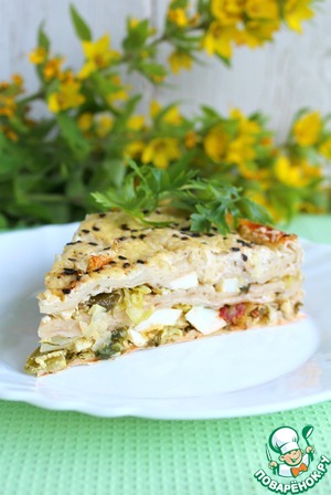 Простой, практически диетический пирог с начинкой их молодой капусты, зелени, отварных яиц, нежной брынзы и вяленых помидор - нежный, со сливочным вкусом, он так пахнет летом - попробуйте! Рецепт был написан в тетеради -автор не указан, я немного добавила-убавила по своему вкусу!