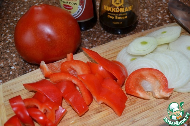 Режем лук и перец.