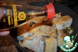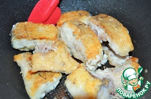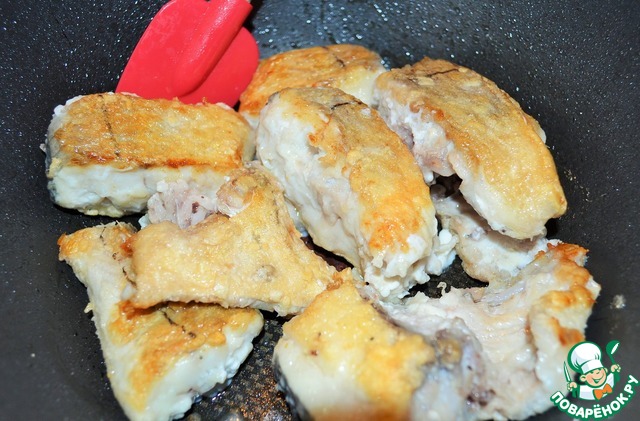 Параллельно обжарить рыбу на 2 ст. л. растительного масла, до румяной корочки по паре минут с каждой стороны.