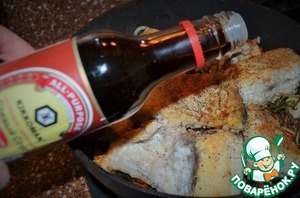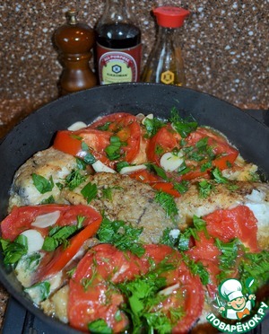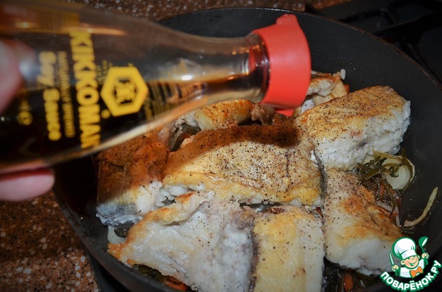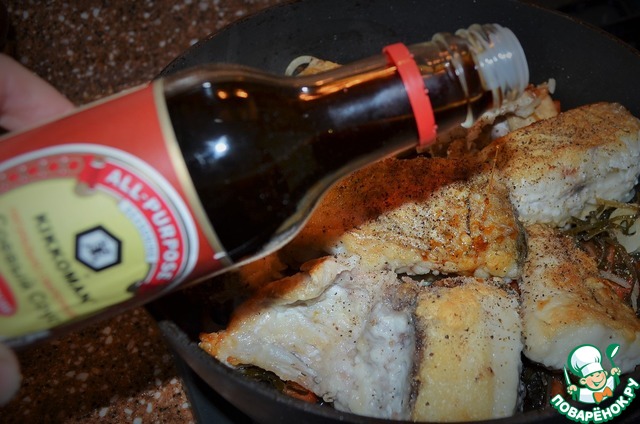 Разложить на овощи куски рыбы, поперчить. -