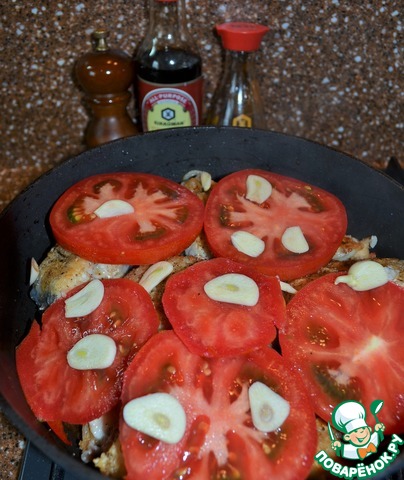 Помидор порезать на шайбы, чеснок почистить и нарезать на лепестки. Выложить на рыбу помидоры и чеснок.