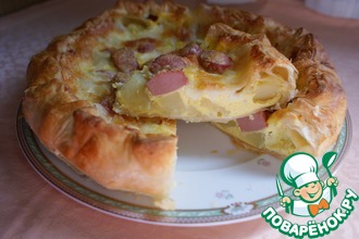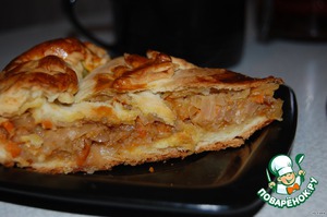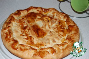От теста отделить 1/3 для верхушки пирога, остальное раскатать, выложить в смазанную маслом форму, заполнить начинкой. Накрыть верхним слоем, защипнуть края. Выпекать 30 минут при t 200 градусов.