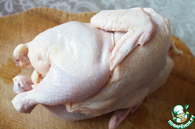 Тушку цыпленка - корнишона помыть и убрать остатки перьев, если есть.
