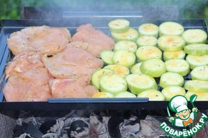 • Разжечь мангал, дождаться пока угли подернутся сединой. Выложить на одну половину противня куски индейки, на другую половину кабачки.