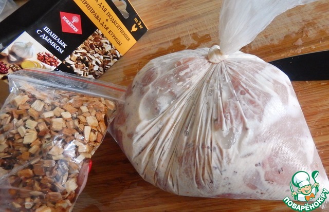 Щепу, из набора шашлык с дымком, залить водой. Залить курицу кефиром и добавить специи, все хорошенько перемешать. Оставить мариноваться на 30-40 минут.