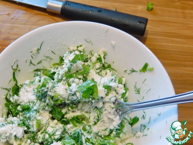Зелень намыть и мелко пошинковать, набор трав можно расширить по вашему желанию, но мы любим классику. Смешать зелень с сыром.