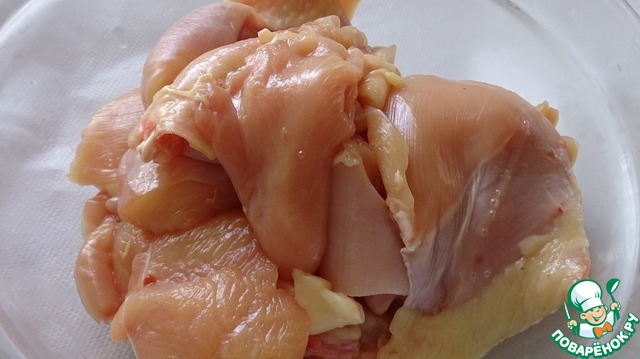 Куриное филе нарезать небольшими кусочками. Можно использовать как грудку, так и мясо бедрышек.
