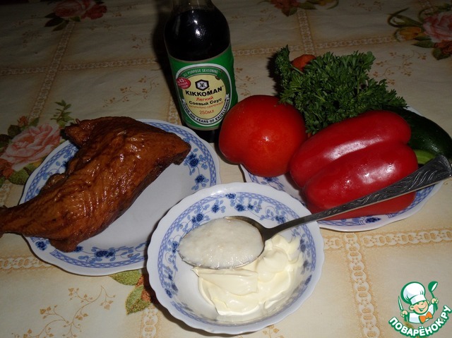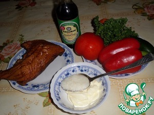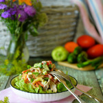 В чашку выкладываем нарезанные овощи, зелень и куриное мясо.