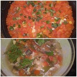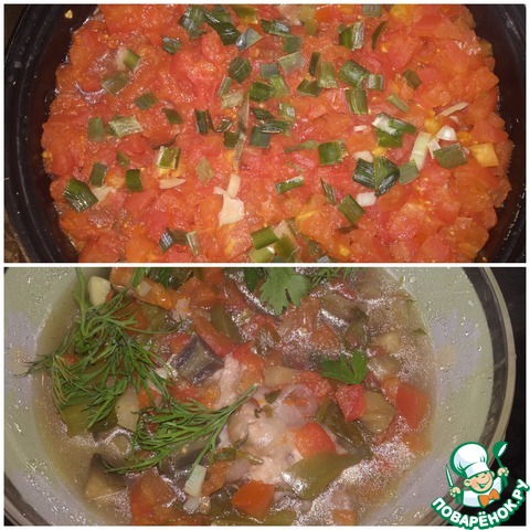 Очень вкусно получилось)Готовила в мультиварке в следующий раз воду совсем добавлять не буду. Помидоры я не чистила, а вместе с зеленью перебила в блендере и залила этим соусом. По совету комментаторов вместо картошки положила кабачок обалденно буду готовить еще